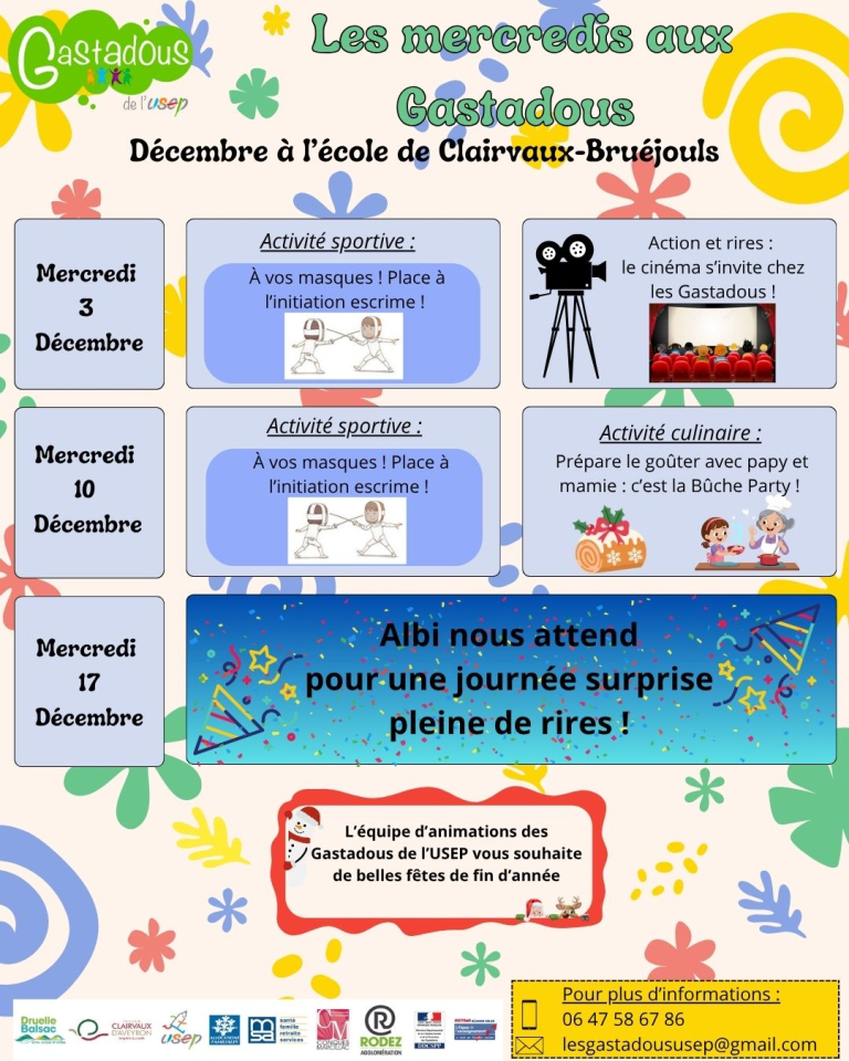· Les + de 6 ans iront à la salle des fêtes de Clairvaux pour assister au spectacle « Et si on rejouait l’histoire ? », autour de l’égalité filles/garçons, proposé par l’association Échappée Belle et la Communauté de communes de Conques-Marcillac.